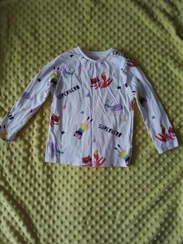 Белый реглан с длинным рукавом, украшен ярким принтом Superhero. Легкий, мягкий и приятный к телу, хорошо подойдет для садика или ежедневной носки.Вик 3-4 рочки.