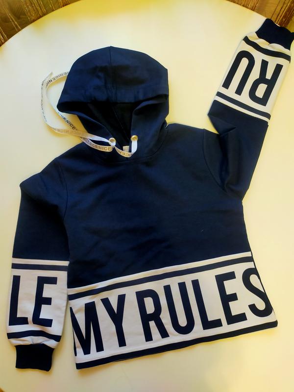 Реглан короткий синего цвета с надписью,капишоном.Носили в 7-9 лет