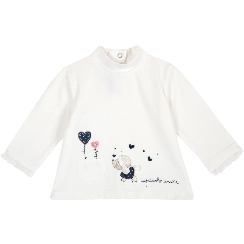 Ткань 1: 95% хлопок, 5% эластан Ткань 2: 100% полиэстер Трикотажный реглан Chicco "Ruby" для девочки, с длинными рукавами и высокой горловиной. Особенности: спереди принт с элементами вышивки; манжеты декорированы вставками из сетчатой ткани; на спинке застежки - кнопки (до 86 размера); модель - Regular.