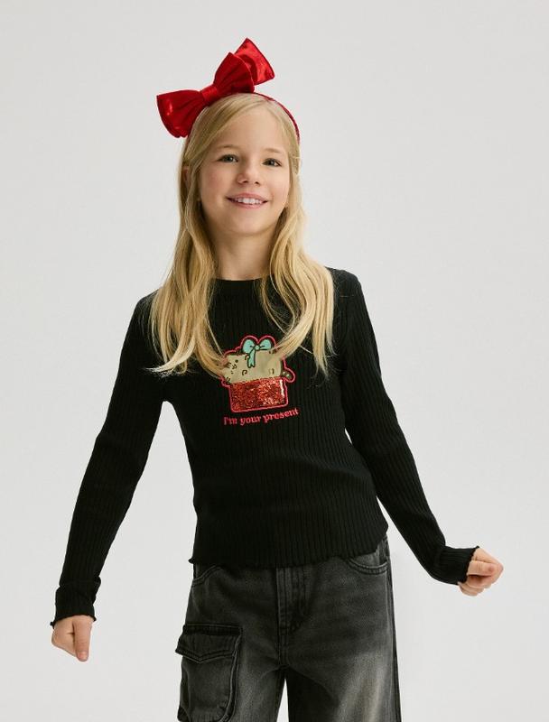 Реглан в рубчик для девочки в черном цвете с изображением пушина Состав: 95% хлопок, 5% эластан