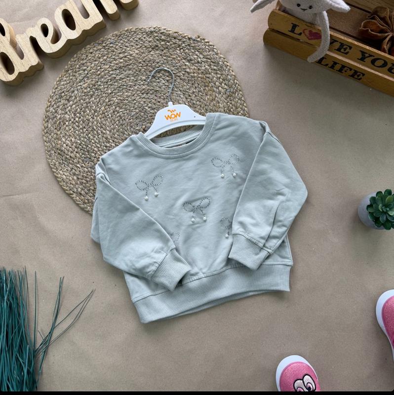 Удобный детский свитшот оверсайз с спущенным плечом, производство Турция. Тканина двунитка, намистини та стрази. Универсальная вещь для садика, школы или прогулок! Размеры: 86- рукав спущен 34 / длина 30 92- 36 / 31 98- 38 / 33 104- 41 / 34 Цена: 575 грн Крохпелька