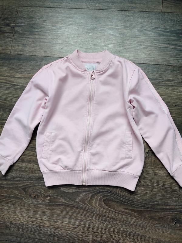 Кофта на блискавці для дівчинки,на зріст 122. На рукавах гарний блискучий сіро-рожевий лампас. Довжина 43см, ширина під руками 38см,плечі 32см,рукав від плеча 39см. Якість гарна,стан хороший. Є кармани