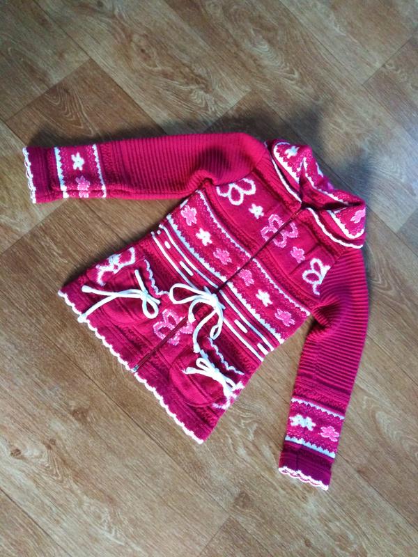 Кофта тепла в'язана. Для дівчинки 5-6р. Заміри дивіться на фото. Має дрібненькі катишки. Стан дуже хороший.