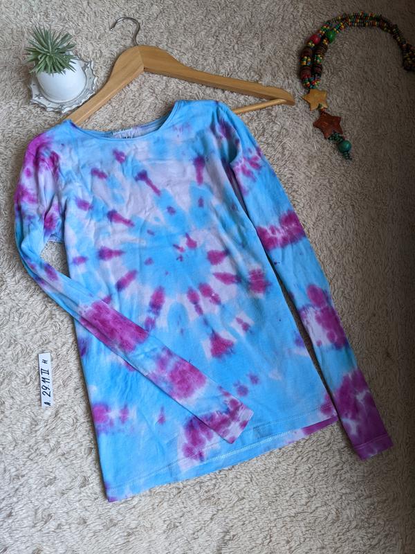 красивый реглан в стиле Тай дай h&m 10-12 лет в груди 39 рукав 54 спинка 56 есть незначительная скошенность шва в самом низу примеряли на ребёнка в носке этого не видно хлопковый натуральный)