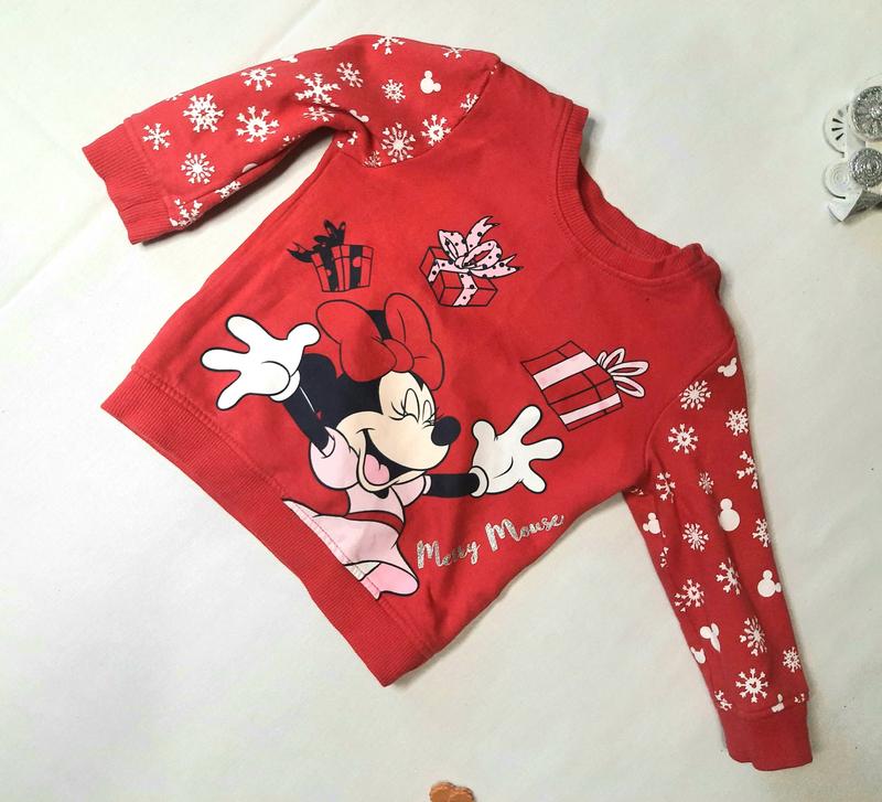 Яскрава червона кофтинка з принтом Міні Мауса попереду і білими сніжинками на рукавах. Не має недоліків. На лівому плечі застигаєтбся на дві кнопки. Розмір 80. Ширина плеч - 22см, довжина рукава - 26см, довжина спинки - 31см. Склад: 100% бавовна, утеплена з середини. Чудово підійде до новорічної фотосесії.