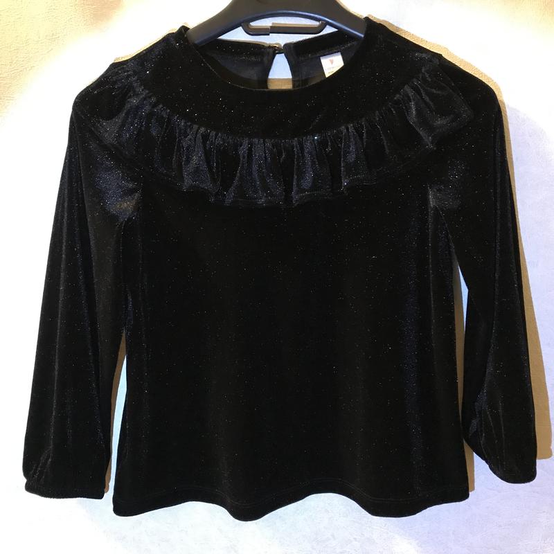 Нарядна кофта з рюшами , виблискує золотом . Тканина велюр . Рукав на резинці. Застібка сзаді на гудзику Розмір 8. Можна від 6