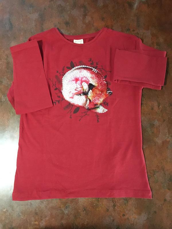 Стильный реглан для девочки от известного испанского бренда Zara. Шикарный терракотовый цвет! Модная яркая аппликация! Приятная ткань! Отличное качество! Состав: 100% хлопок. Размер в наличии: 8 лет (рост 128 см)