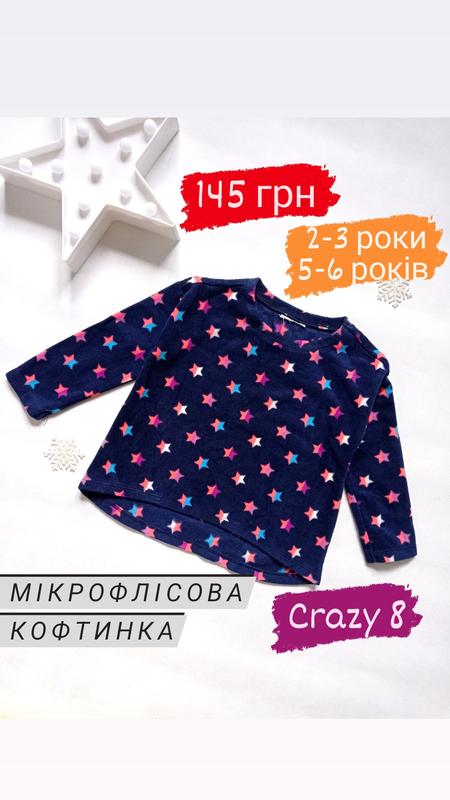 Кофточки со звездами из микрофлиса. Сзади удлиненная, плечевой шов слегка занижен. Кофточка немного свободного кроя. Бирки срезаны, но кофты новые. Размеры в наличии: (длина спереди) 5-6 лет - длина 41 см, рукав от горловины 46 см 2-3 года - длина 32 см, рукав от горловины 36 см 18м, длина 30 см, рукав от горловины 34 см 12м - длина 28,5 см, рукав от горловины 31 см #crazy8 #флисоваякофта #флисканадевочку #флиска #детскаяодеждачеркассы #дитячийодягукраїна