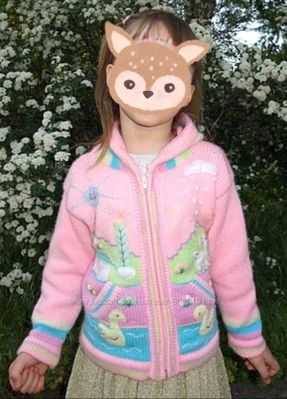 Розовая с рисунком теплая кофточка на 5-6 лет, рост 110-116 см. в ОТЛИЧНОМ состоянии! Замеры: Длина 40 см Длина рукава 35 см ПО груди 34 см.
