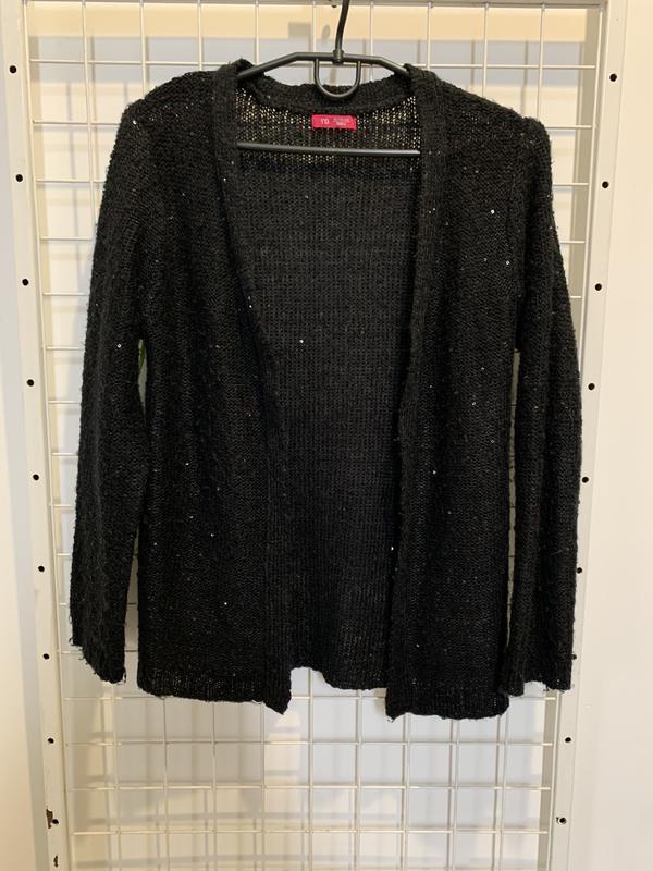 Красивий кардиганчик накидка переливається, нарядно виглядає з паєтками, YD Розмір вказаний на 12-13 років на ріст 158 см Стан б.у, дифектів нема але є малопомітні катишки при бажані можна обстригти