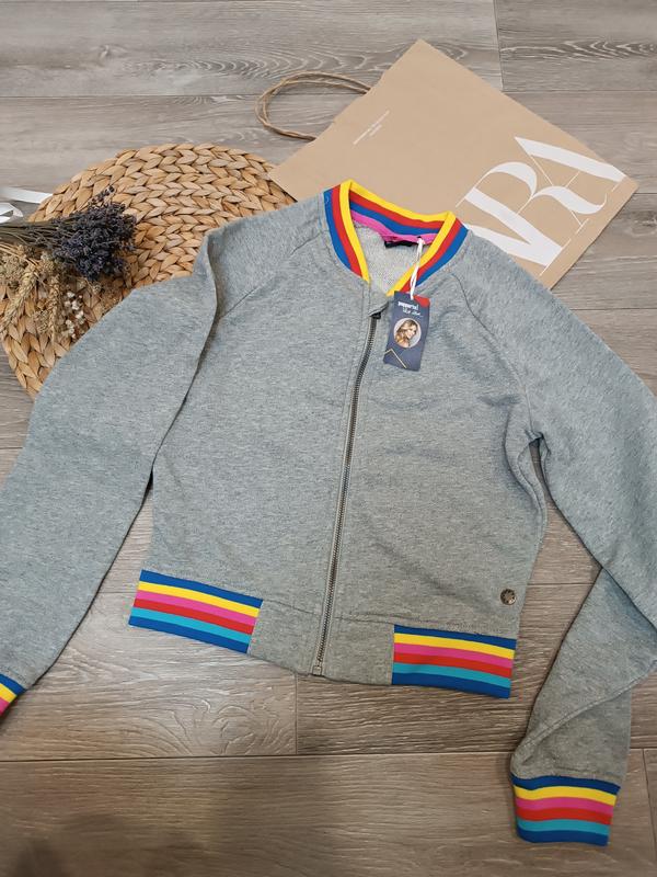 Новая укороченная кофта на застежке с люрексом и яркими резинками. Трикотаж тринитка. На 158-164см на 12-13роков. Длина 48см, ширина 40, рукав 67см.