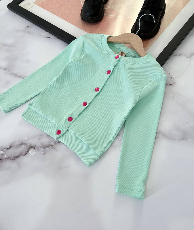 СТИЛЬНА КОФТА ДЛЯ ДІВЧИНКИ -Тканина рубчик, 95% бавовна 5 % еластан хорошо тянется -Производство Турция -Цвет : МЯТНЫЙ Размеры: 4-5 лет рук 36 см пог 29 см длина 39 см (11 шт) 5-6 лет рук 38 см пог 31 см длина 41 см (8 шт) 6-7 лет рук 40 см пог 32 см длина 44 см (11 шт) 7-8 лет рук 42 см пог 33 см длина 45 см (11 шт)
