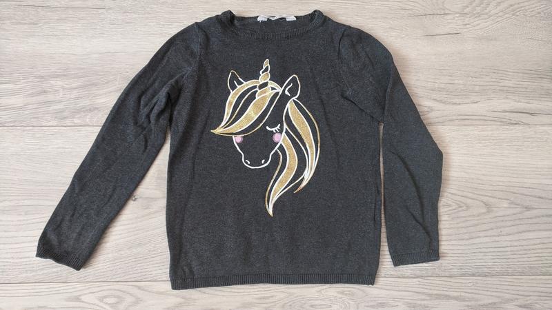 Кофта H&M 6-8р, тонкая в"повязка, украшена рисунком с блестками. Стан очень хорош, есть маленькие катышки под руками, в носке вообще не видно.