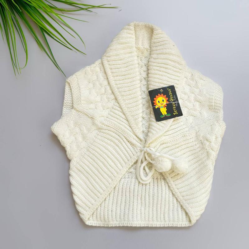 Жилет вязанный для девочки белого цвета с воротником. По переду завязывается. Качественная машинная вязка. Пряжа - акрил 100%. Размер на 1-2 года.