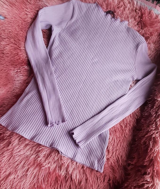Очень нежный лиловый гольфик в рубчик, камера плохо передает цвет ( менее насыщенный чем на первом фото, и больше чем на втором 😊) Ткань натуральная, 97% хлопок, красиво тянется и очень приятный к телу. Состояние новое.