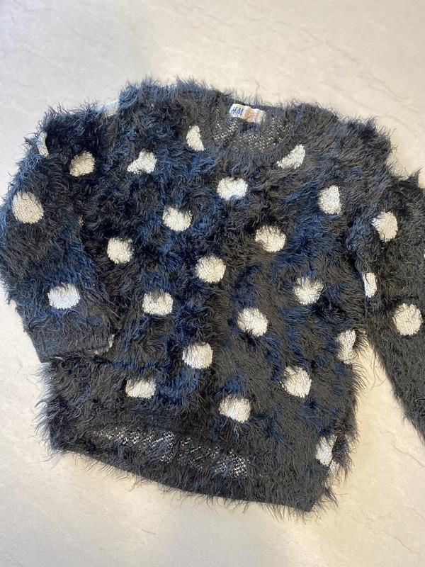 Крутезна кофточка в горошок. Тепла та м‘якенька. Стан ідеальний! Розмір 110/116: - довжина - 42 см спереді та 44 см по спині; - рукав - 40 см; - між підмишками - 35 см; - плечі (від шва до шва по верху) - 27 см.