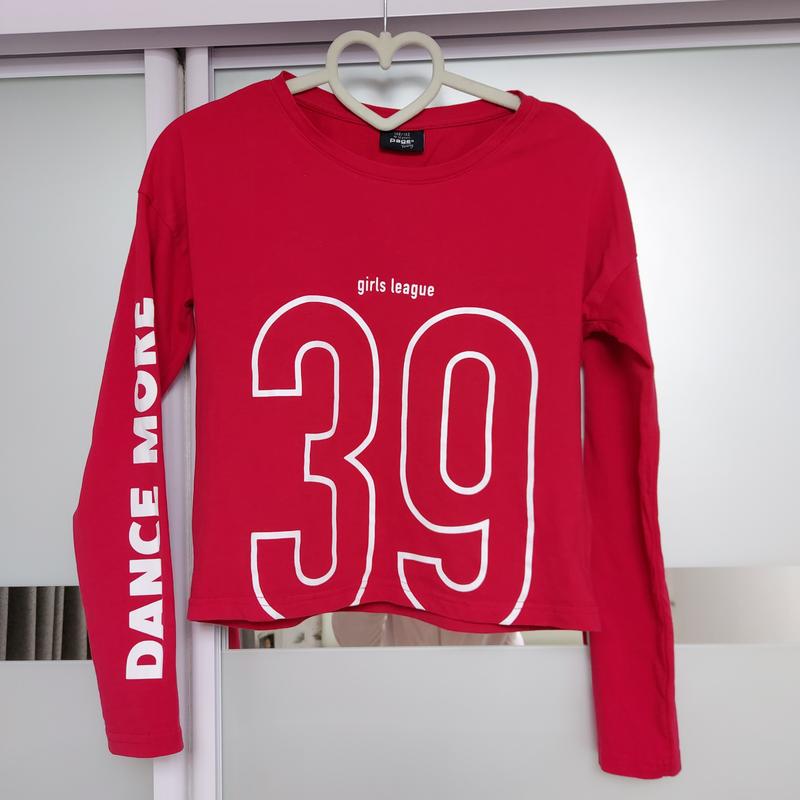 Укороченный лонгслив очень приятный на ощупь. На комоде и рукавах есть надписи. Стан - идеальный. Заміри на фото.