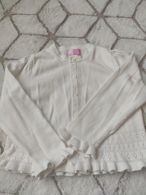 Продам новую белоснежная кофточка для девочки на 5 рочков. Очень нежная. По низу перфорация. длина рукава от плеча 37 см (вместе с оборками) длина кофточки от плеча 34 см (вместе с оборками) ширина 33 см Товар возврату не подлежит!