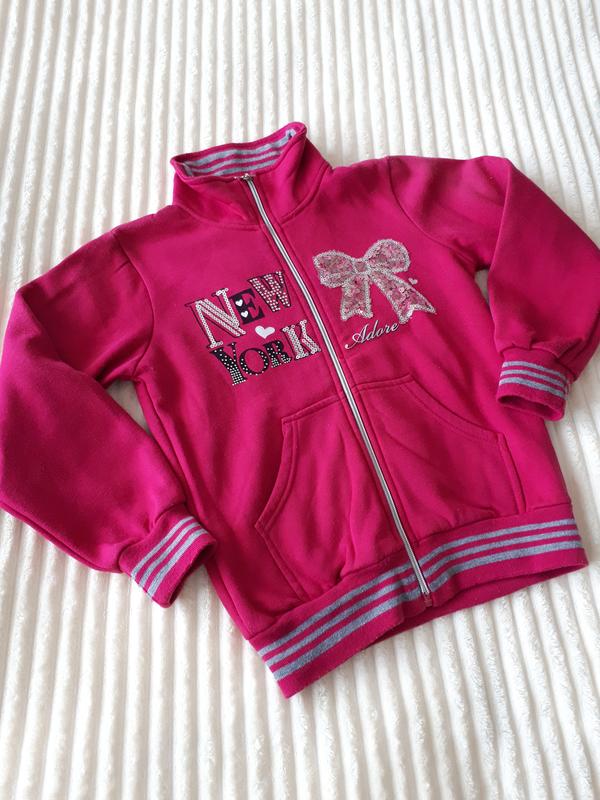 Кофта спортивная розового цвета для девочки. Материал: 85% хлопок, 15% полиэстр Размер: 134-140 см, на 9-10 лет Состояние: отличный