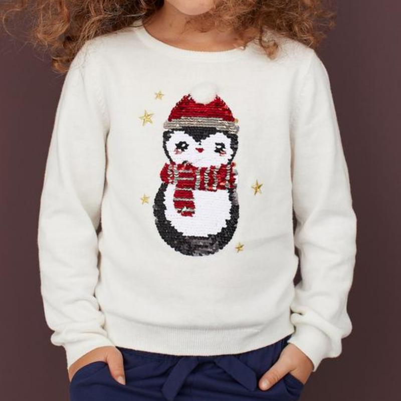 Кофта, реглан с новогодним - рождественским принтом. Для девочки 2-4 года. Кофта белого цвета с пингвином вышитым пайетками. Стан хороший. Имеются дефекты пятна на рукаве и спине.