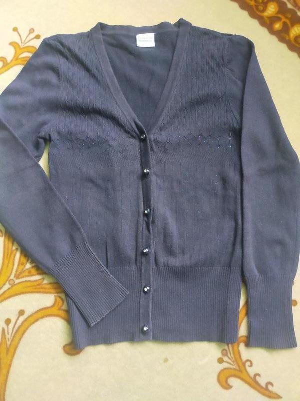Теплая кофточка с мини-стразами голубого цвета, очень красиво сверкают, нежно, фото не передает. Кофта темно синего цвета, без катышек, качество шикарное. Длина 59 см, подмышками 42 см плечи 38 см, рукав 59 см