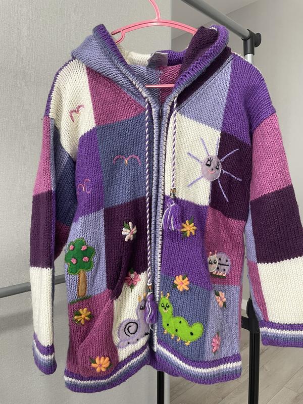 Очень оригинальная и теплая кофта с большим капюшоном. Состояние отличное, только полосканный «язычок» на застежке. Очень теплая и мягкая. Шерсть альпака