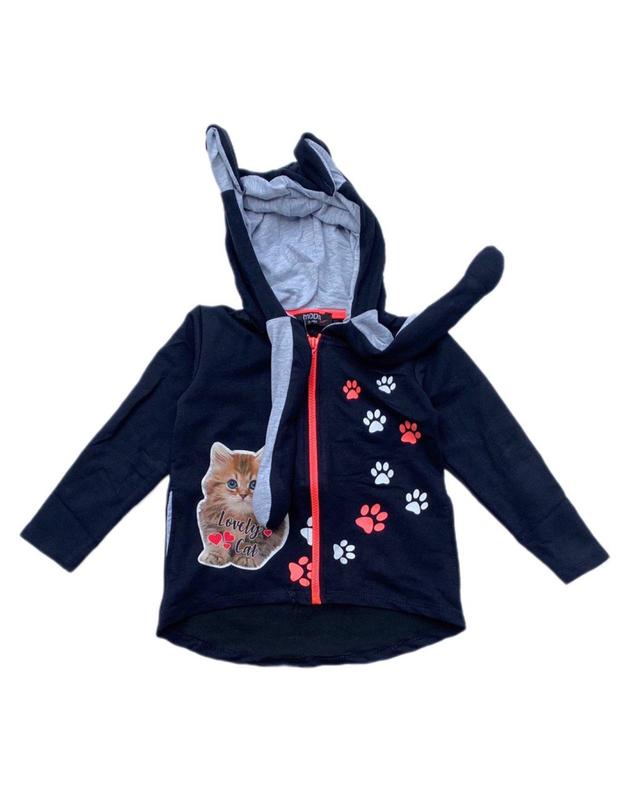 Интересная новинка для девочек. Кофта на молнии в темно синем цвете с рисунком коттеятка. Особенность кофты в том, что у нее при накачке поднимаются ушки.Стильно и не привычно!