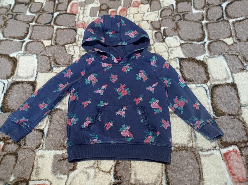 Кофта с капюшоном спереди карман. Цвет синий рисунок розочки. На рост 86-92 смотрите замеры.