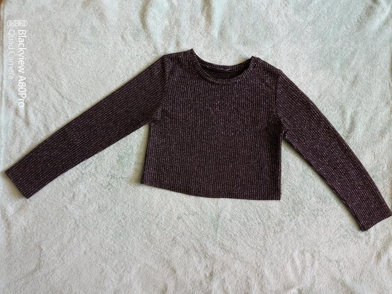 Кроп-топ, реглан укороченный ТМ George на девочку 6-7 лет. 116-122 г. Классно смотрится на ребенке. Цвет черный с люрексовой нитью. Ширина - 31 см. Длина - 32 см. Длина рукава - 43 см.