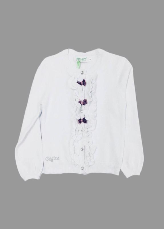Очень красивая и стильная кофточка для девочки.Кофта в белом цвете, застегивается на пуговицы. Изделие декорировано рюшами и бантиками.Идеально подойдет для праздника и прохладных ранков.