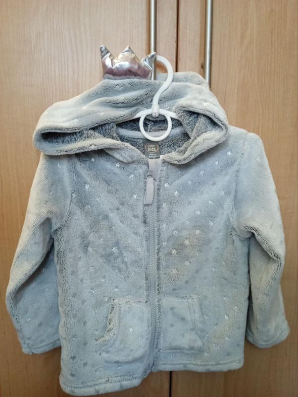 Тепла кофта на дівчинку з короною на капюшоні, дуже мʼяка до тіла, приємна на дотик. На блискавці. В ідеальному стані, купували в Польщі в Pepco, носили мало.
