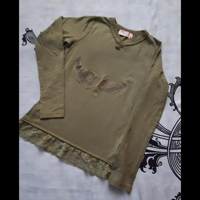💥1+1=3. Фірмова кофта на дівчинку. Колір насичений хакі як перше фото. Спереду вишита птаха розшитий дрібним бісером, колір однаковий всюди, так відсвічує камера Сток. Ідеальний стан. Без плям та пощкоджень.