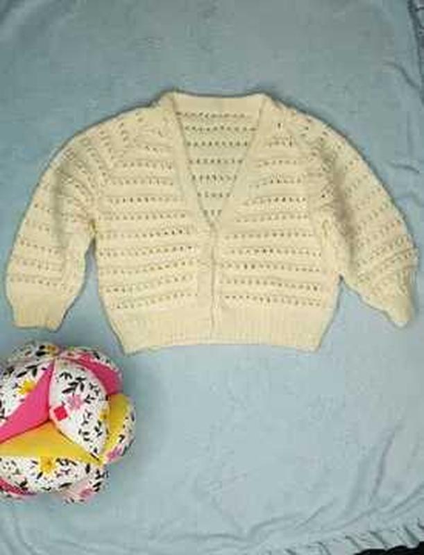 Ажурная кофточка на девочку 3-6 месяцев ручной вязки. Застёжка спереди на 4 пуговицы. Длина кофточки 26 см От горловины до края манжета рукава 29 см Цвет экрю Ручная вязка , handmade