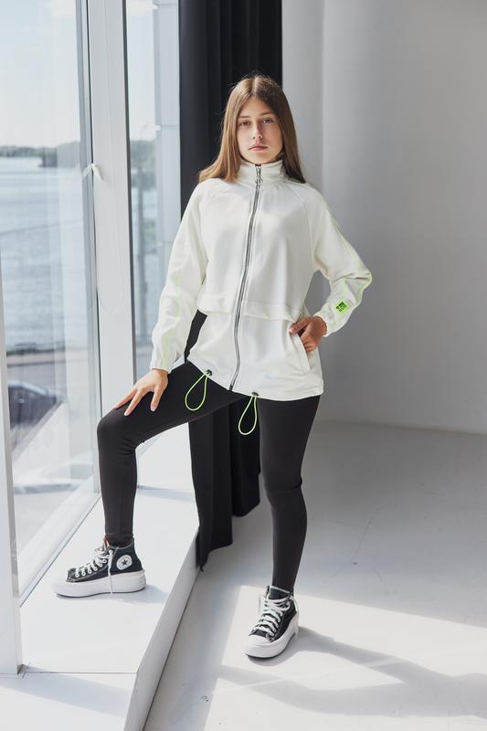 Удлиненная кофта для девочки. Кофта молочного цвета на молнии, снизу стягивается шнурком. Рукава кофты на манжете. Кофту можно носить с джинсами и лосинами. Склад: 75% бавовна, 18% поліестер, 7% еластан.