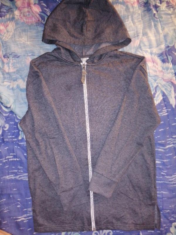 Темно серая кофточка на замке с капюшоном. Слегка утеплённая. Рукава на манжетах. Низ прямой, по бокам с разрезами. Молния блестящая Не новая, состояние идеал. Замеры :длина изделия по спинке от шеи 64.5 см, полуобхват груди 47 см, низ 45 см, длина рукава с манжетом 46 см, внутренний 36 см.