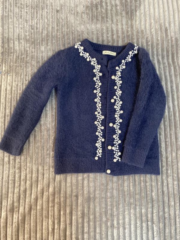 Темно синего цвета. Бусинки белые, не облезшие... Мы одевали вместо куртки. Тепла , мягка, приємна кофта