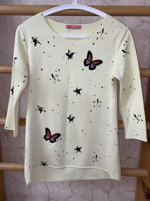 Туника для девочки желтого цвета с узором - звезды и нашитыми бабочками. Размер на бирке - 164 см / 14 лет (но можно и на 158 см). Сзади есть невежевые черные разводы, но они сливаются с узором и при носке незаметны. По добавке информацией обратитесь в частные сообщения.