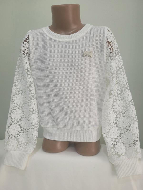 Нежная трикотажная кофточка с красивыми кружными рукавчиками Хорошее качество! Замеры длина/рукав/пог 122 -40/45/37 128- 43/47/38 134- 45/49/39 140- 48/52/39 candy