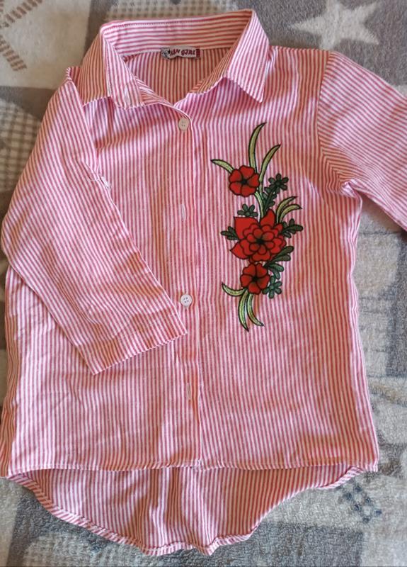 Рубашка на девочку с вышивкой (50 хлопок, 50 полиэстер) Рукав 3/4-30см (есть пуговицы для подворота), плечо -9, длина перед 43 (спинка 52), ПОГ-37