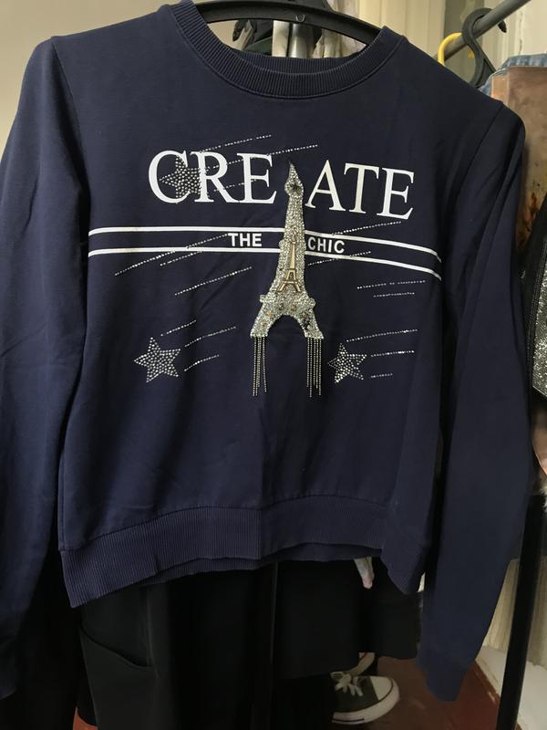 Тоненькая кофта в хорошем состоянии Зади принту нет В некоторых местах нет бриллиантиков, но это не заметно Замеры: ширина по плечам 37 см Длина рукава 55 см Длина изделия 46 см