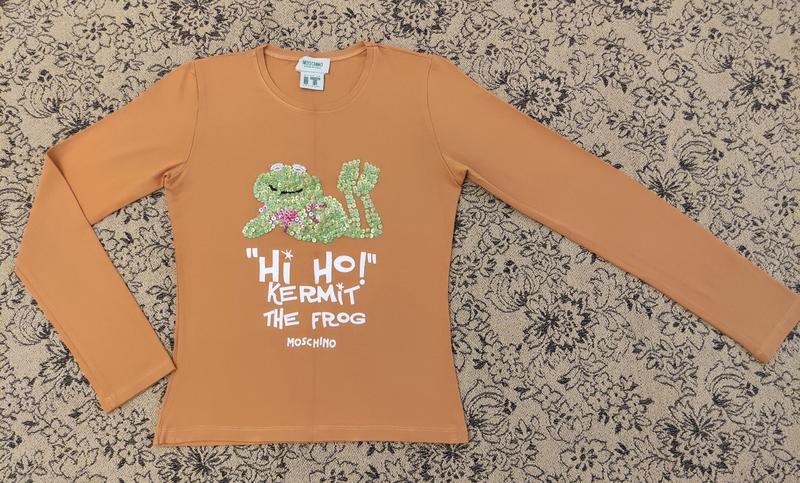Moschino стильный лонгслив 13-14 лет, бу, состояние отличное. Лягушонок из пайеток. ширина 38, длина 50, рукав 56