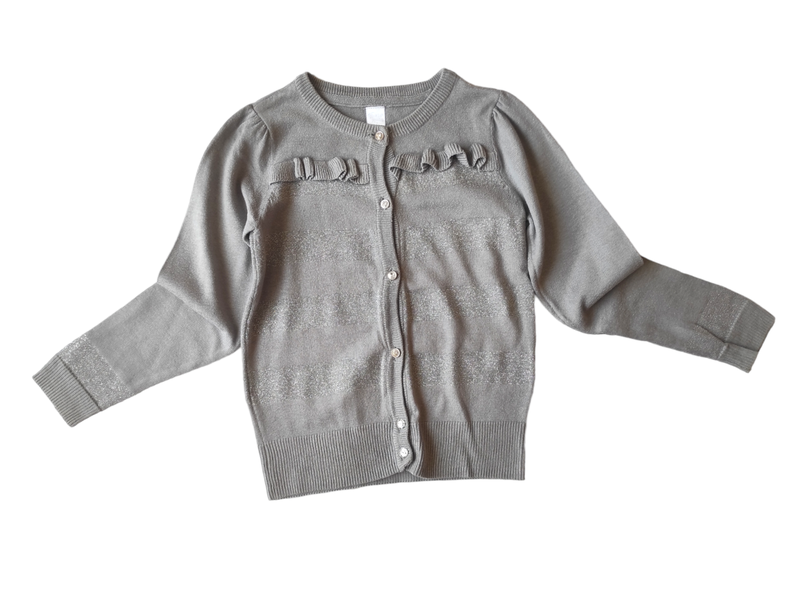 Кофта серая (есть полоскашки с люрексом), очень красивых пуговицах. Фирма Gloria Jean's, размер 4-6/110-116 Можно носить дольше. Замеры: рукав 47 см + 6 см плечо, по 34 см, длина 46 см.