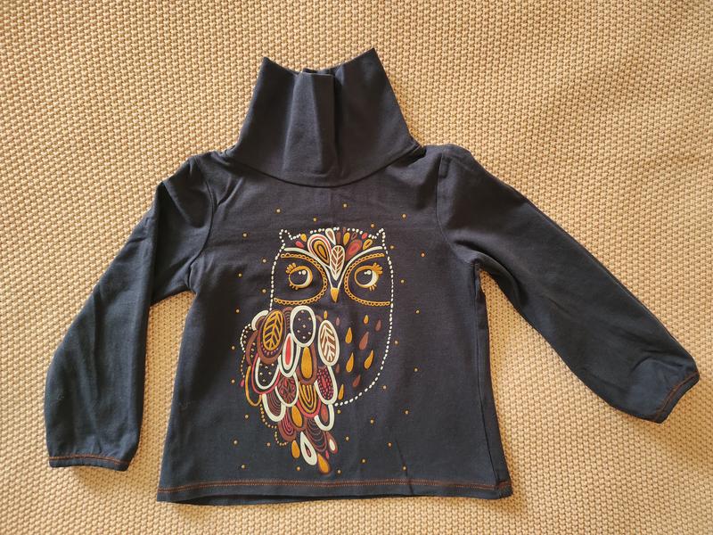 Красивая кофточка с горловиной. Рисунок очень красивый, милое совенок с блестками. Состояние идеал, только раз одели и снова выстирали.