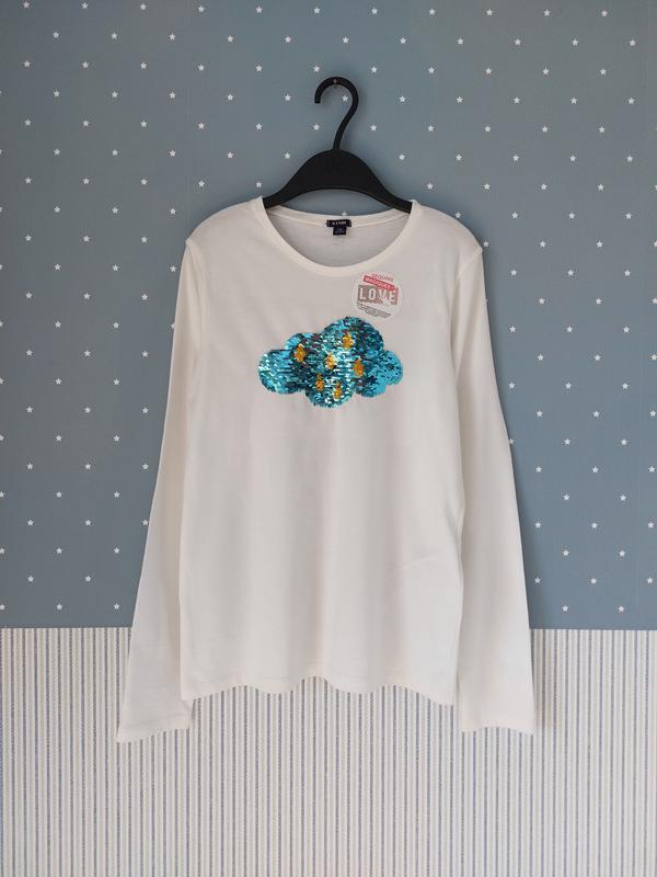 Реглан із пайетками-перевертишами. Є невелика плямка, яка відіпреться. Розмір 146-152: ▪︎ довжина - 55 см; ▪︎ плечі - 33 см; ▪︎ НОГ - 39 см; ▪︎ рукав від плеча - 55 см, від пахви - 44 см. Склад: 100% бавовна.