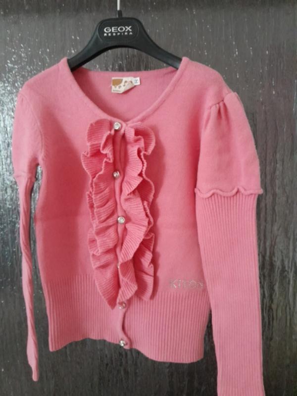 Очень красивая нежно-розового цвета.Ухаживает дорого.Тепла.В составе 100% хлопка.Производитель Турция. Наделы мало,стан новой.Комповали к выпускному платью в садик.вотрите платье и кофточку на ребенке в своих объявлениях.Если нужно сделать замеры.
