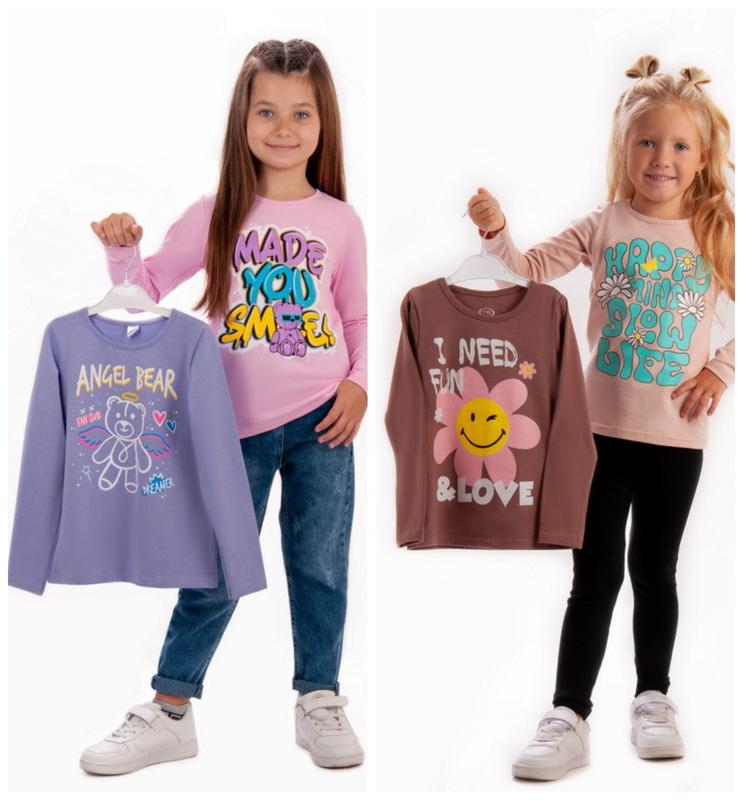 Набір футболок з довгими рукавами для дівчаток стане прекрасним доповненням до гардеробу юних модниць. Футболки з еластичного стрейч-куліру, виконані в різних кольорах зі стильними малюнками. Полотно відмінної якості, при правильному догляді не дає усадку, не линяє, не скачується. Футболки універсальні, носити можна з джинсами, брюками, спідницями, під будь-яке взуття. Полотно: стрейч-кулір Склад: 95% бавовна, 5% еластан Рекомендації по догляду: прати при температурі не більше 30°C, принт прасувати тільки по вивороту.