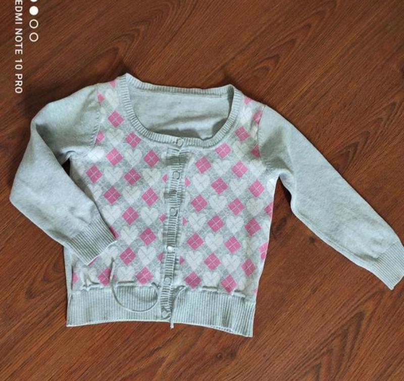 у наявності кофта на дівчинку 4 роки довжина 40 см пог 33 см, рукав-37 см стан речі можна сказати дуже хороше, ні катишек, ні плям.