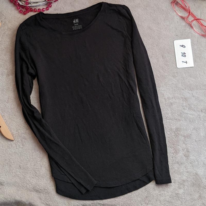 Якісний чорний реглан h&m 9-10 років половина віскози половина бавовни спереду трішки скошена дуга хто носить h&m знає що це трапляється часто і це не критично довжина рукава 51 см від плеча лінія плечей 31 довжина спереду 49 ззаду 53. пог 37-46