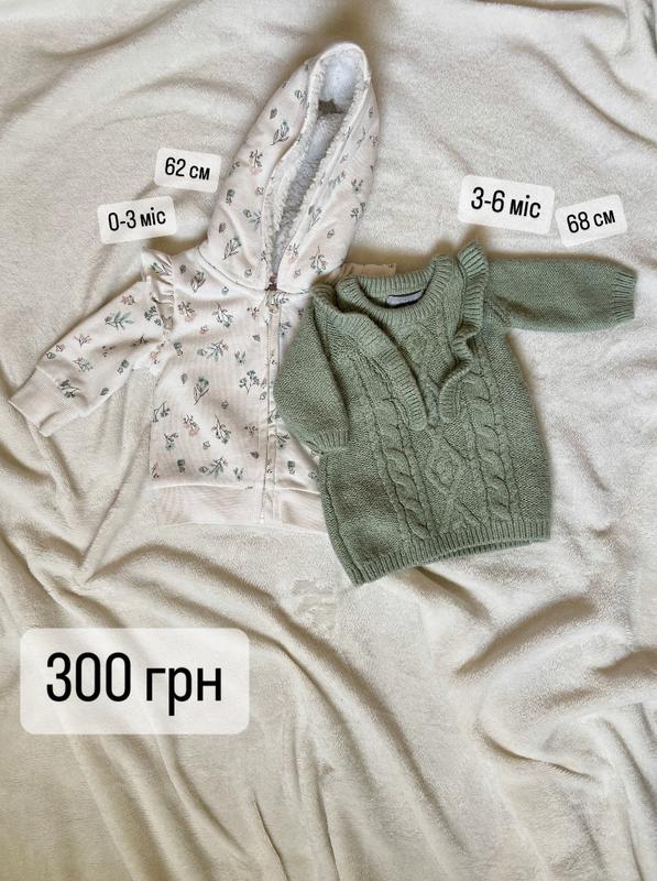 Теплые кофты на девочку. Можно купить вместе, можно отдельно кофта на замочке - 62 см, на флисе с утепленным капюшоном 100 грн вязаная кофта - 68 см (маломерит) тоже достаточно тёпленькая 120 грн Состояние супер, если вместе за 200 грн