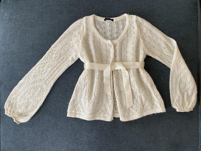 Красивая нарядная молочного цвета кофточка итальянского бренда Sisley. Имеет на лифе стразики. Вдягалась на свята. В идеальном состоянии. Без потертостей, скашей и посторонних запахов. Этикетка отсутствует. Я ее срезала, потому что выбивалась через кружево ткани. Размер на возраст 7-8 лет. В составе есть шерсть. Конечно же есть добавки.
